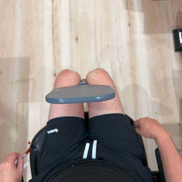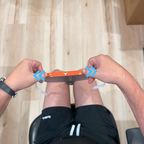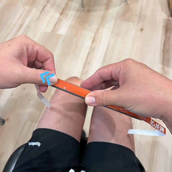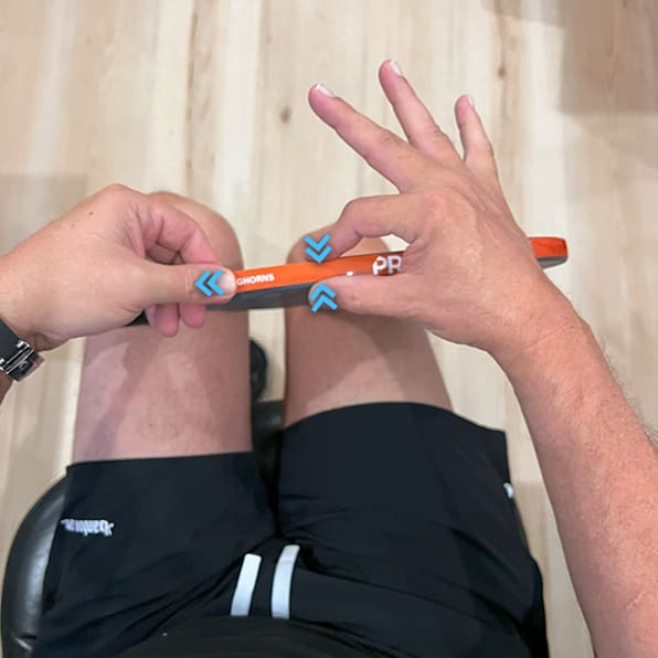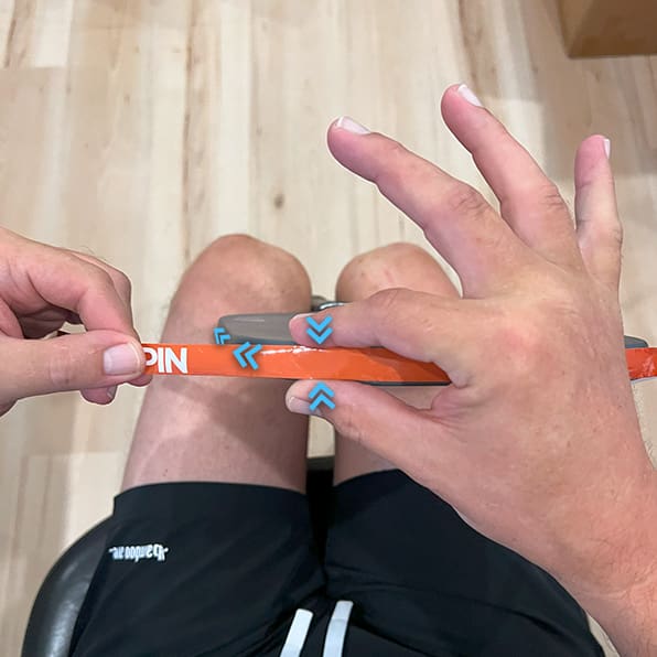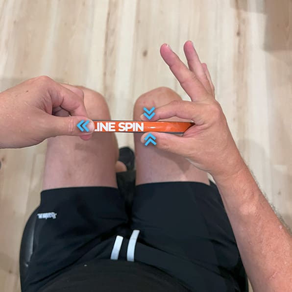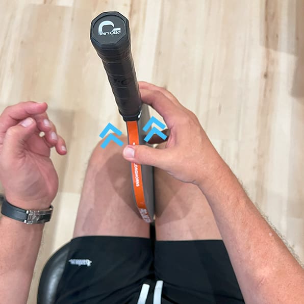 Sit in a stable chair with your feet flat on the ground. Place your paddle vertically between your knees with the edge facing up and the paddle face pointing straight ahead. This position keeps the paddle steady for precise alignment.You will notice the edge of the paddle is flat with no texture to make the application easier.