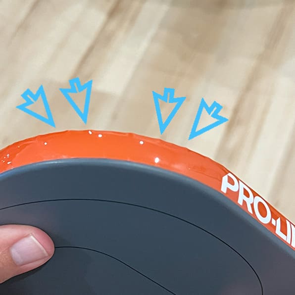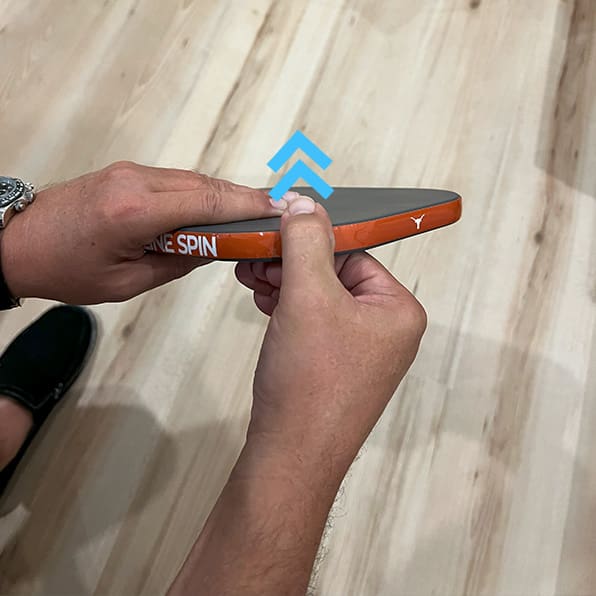 Peel and hold the Skinz above the top edge of the paddle. Align it carefully so it’s centered left to right. At the same time, pay close attention to the narrow width of the edge—keep the Skinz strip centered so it doesn’t roll onto the paddle face or back. Once it looks even, lightly press the Skinz into place. Don’t stress if it’s not perfect—the material is very forgiving and can easily be pulled up to reapply.