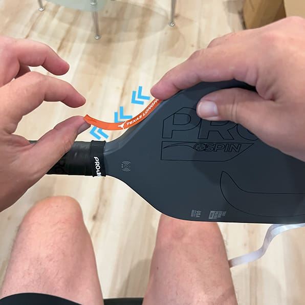 Continue pressing the Skinz tightly along the final stretch until it meets the top of the grip. Make sure to press the Skinz firmly down from the paddle 7:00 corner to the grip, or the tension around the curve will pull up over time. Continue to work this section ongoing until the adhesive truly sets.